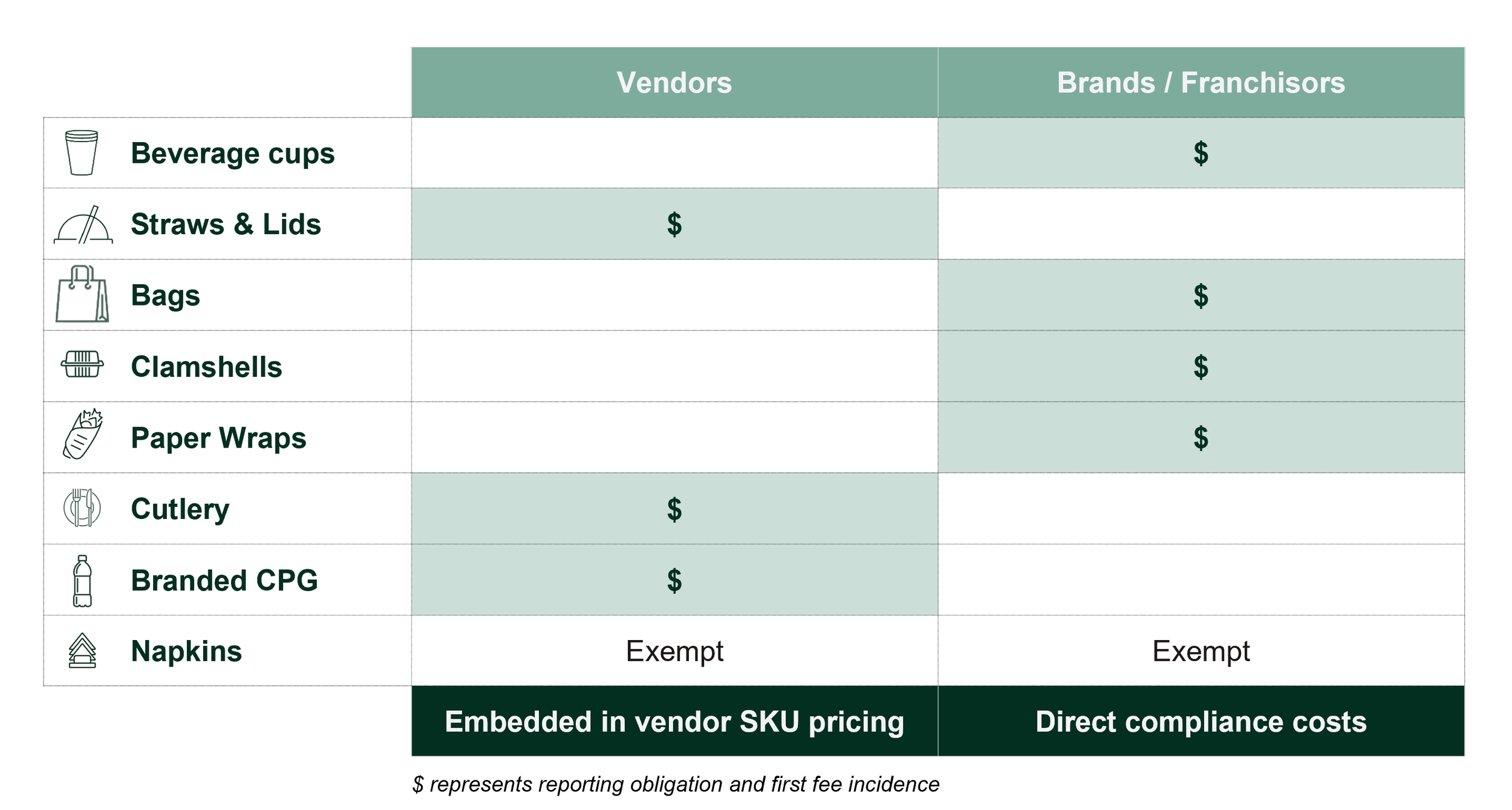 Total exposure was estimated at $18M–$27M in the near term, with a long-term range of $26M–$58M if all seven enacted states come online and vendors pass through full fees. The sponsor had a brand-by-brand breakdown, a methodology it could defend to deal teams, and a clear view of which concepts carried disproportionate exposure, all before a single brand supply report was filed.